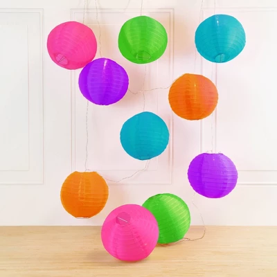 Battery-operated LED string lights with nylon lanterns create a festive atmosphere to an indoor or outdoor event. Weather resistant lanterns are an economical way to add a splash of color, illumination and dimension to a special occasion. The vibrant color creates a beautiful ambiance on a patio umbrella, a party tent, tree branches, deck railing or above a table setting.