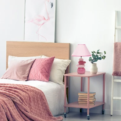 Stones of ceramic in pink variations stack vertically to create a lovely sturdy base beneath the empire fabric shade in a light pink with darker pink trim. This table lamp is the perfect fit to add a little colored décor to your space and even works in a nursery or child’s room!