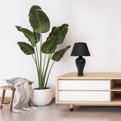 This beautifully designed table lamp made primarily of ceramic features a bendy and curvy shape with an imprint style texture throughout its painted base, in the color of your choice. It is then paired with a matching empire fabric shade that compliments its surrounding environment perfectly while illuminating your space just right.