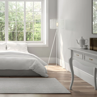 Style yourself a chic and cozy reading corner or just enhance your home’s lighting with this 61″ Ingrid White Cage-Shade Metal Tripod Floor Lamp from River of Goods. Featuring an all-metal construction in a crisp, matte white finish for a clean look you’ll love, this freestanding floor lamp is a great addition to your living room, bedroom, entryway or home office. Thin tripod legs offer an eye-catching look that’s perfectly designed for placing in a corner, while the open-style cage-shaped round shade is covered in allover cutouts to let a 60-watt E26 or equivalent LED bulb (not included) shine through. Plus, this decorative floor lamp features a 90-inch power cord to provide ample reach to a wall outlet and give you plenty of placement options.