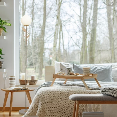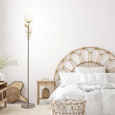 The 65.5″ H Raven Candlestick Floor Lamp from River of Goods makes a unique and stylish addition to your interior lighting. Showcasing a gold and silver finish candlestick base with arrow fletching-like side accents below the white frosted glass globe shade, this floor lamp exudes modern style. It casts a soft, warm glow with one 60-watt E26 bulb (not included) and is also LED compatible. Best of all, the 90-inch power cord with a foot switch allows for versatile placement and easy on/off.