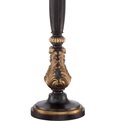 With a glass shade framed by scalloped leafing, this regal torchiere floor lamp draws attention to its majestic qualities with dramatic detailing. Wood tones combined with muted gold and a frosted glass bowl convey a finished elegance while casting an inviting, warm light.