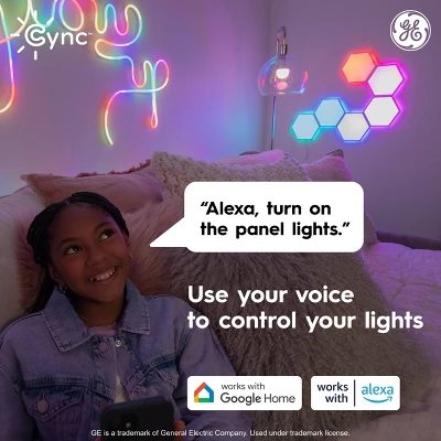 Cync Full Color Dynamic Effects Hexagon Panel Light lets you install modern angular light panels to create a unique design. Create unique wall art by making shapes and organic designs. The hex panels feature scheduling, light shows, music sync and millions of colors to enhance any space – no hub needed. Select from a wide range of white color tones from 2000K to 7000K and pinpoint the perfect white light. Choose from millions of additional colors to enhance the vibe in the room, ideal for entertaining and holiday décor.