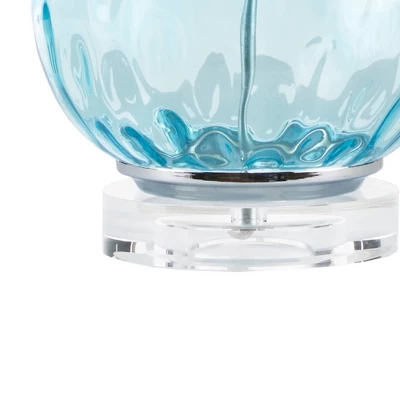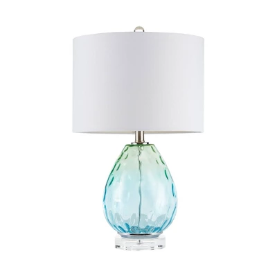 Urban Habitat Borel Ombre Glass Table Lamp. Beautifully designed, this glass table lamp flaunts a gorgeous blue and green hue that adds a soft touch of color to your room. The white drum-shaped lamp shade tastefully accents the base, while softly filtering the light to give off a warm glow. Plug in to a power source using the 72-inch clear cord and illuminate your décor by flipping the on/off switch located on the socket. Eye-catching and unique, this glass table lamp offers a chic update to your living room or bedroom. One Type A light bulb is needed and included. Comes with a 2-year warranty.