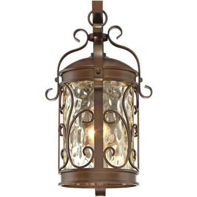 An oil-rubbed bronze finish adds traditional charm to this classic outdoor wall light. From the John Timberland brand of outdoor lighting, the design features amber hammered glass that gently diffuses the bulb’s light for romantic ambient illumination. The scroll accents and curving patterns surrounding the design add to the vintage aesthetic. A traditional look great for porch lighting, around patios spaces, on as garage wall lighting.