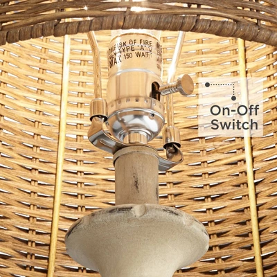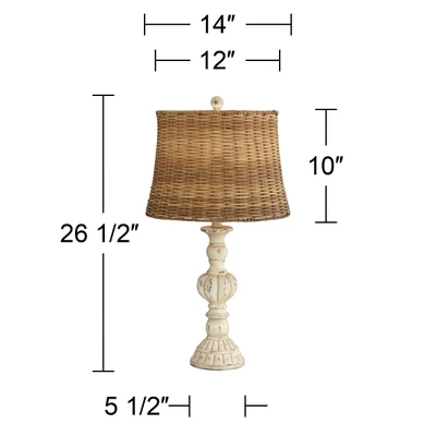 Mixing two distinct styles, these table lamps offer a delightful design that brims with cottage and island inspiration. In a convenient set of two, each lamp comes in a candlestick frame with an antique white finish that gives it a worn and weary look. Rattan drum shades on top add an organic touch that draws the eye. The result is a set of rustic coastal table lamps that adds decorative charm to your living space.