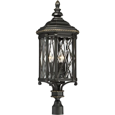 This stunning, traditional outdoor post light in rich black with gold highlights will bring the feel of antique luxury to a your home’s exterior space. Diamond-shape, clear beveled glass cuts are separated by a beautiful lattice framing, creating an exquisite diffuser for the four lights inside. An elegantly detailed treasure from the Minka Lavery Bexley Manor outdoor lighting collection. Post not included.