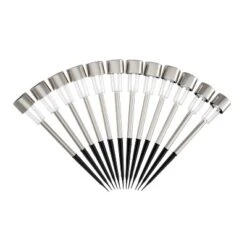 - PRODUCT DETAILS- Height: 12.2″. Material: Anti-Rust Stainless Steel. Color: silver. Battery: rechargeable 1XAA 1.2V 600mAh Ni-MH. Includes 12 Solar LED Path Lights.1 Lumen