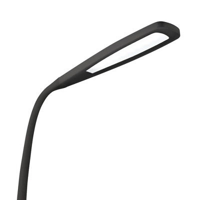 This hardworking LED floor lamp from OttLite seemingly does it all. Super bright LEDs produce a natural day quality light up to 700 lumens. The 12 1/2 inch LED array tops an adjustable column and rubberized gooseneck for a versatile light capable of providing a wide area of illumination. Touch-dimmer allows for simple operation, while a smart memory features automatically remembers your most recent brightness setting. In a matte black finish.