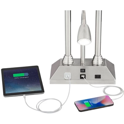 An elegant, contemporary look, this desk lamp adds convenience to any space. Featuring two outlets and a USB port, this lamp makes it easy for you to charge smart devices. It also comes with an LED gooseneck reading light. A beautiful brushed nickel finish completes the design.