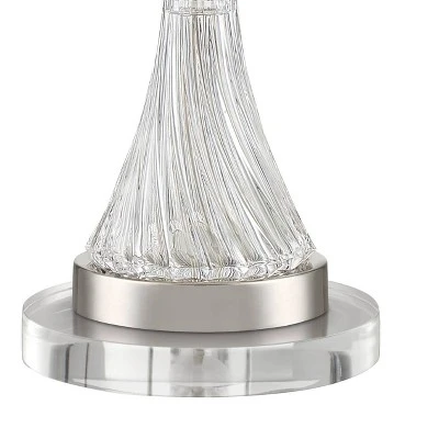 Featuring lamps made with glass, this set of two lovely contemporary table lamps with a USB port from Regency Hill is elegant and attractive. Accented with chrome, these lamps are bold and detailed from top to bottom. Both lamps feature a USB port for versatility and convenience in any setting. Each lamp has a 7″ round riser.