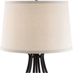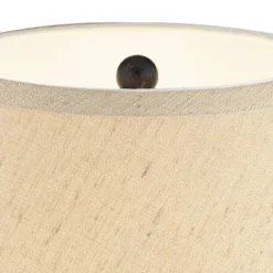 - Bronze finish lamp base. Metal construction. Faux leather shade. 8-foot long cord.