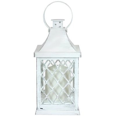 Give the home the welcoming comfort of farmhouse style with this Ligonier indoor candle lantern. This beautiful lantern features an LED pillar candle inside that realistically replicates the flicker of a real flame, white lattice fencing over the front, and a square top with a ring to hang from any indoor ceiling. It is durably constructed of plastic and glass with a weathered white painted finish that recreates the look of metal while remaining durable against the elements when placed outdoors. Each lantern is powered by 3 AAA batteries (please note, batteries are not included and must be purchased separately) and are easy to use with an on/off switch at the bottom. Place a lantern on the hallway table or hang on the wall with the ring on top. There are so many possibilities to incorporate this timeless decorative accent in the garden, yard, kitchen, indoor patio, or on the porch set down or hanging above to best suit any style.
