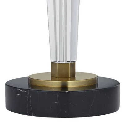 Refresh your decor with this striking clear glass table lamp. From the Vienna Full Spectrum brand of lighting, the modern look features a tapered shape atop a black marble base. Topped with a black drum lamp shade and gold accents. Two pull chain switches offer easy lighting control, allowing you to have one, or both of the bulbs illuminated.